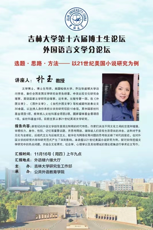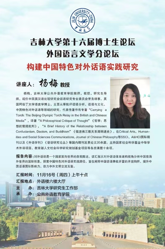 发言题目:选题·思路·方法—— 以21世纪美国小说研究为例 报告人:朴玉 多宝真人网站 教授 报告时间:2023年11月16日9:00 报告地点:吉林大学中心校区外语楼六楼会议厅 发言题目:构建中国特色对外话语实践研究 报告人:杨梅 多宝真人网站 教授 报告时间:2023年11月16日10:00 报告地点:吉林大学中心校区外语楼六楼会议厅