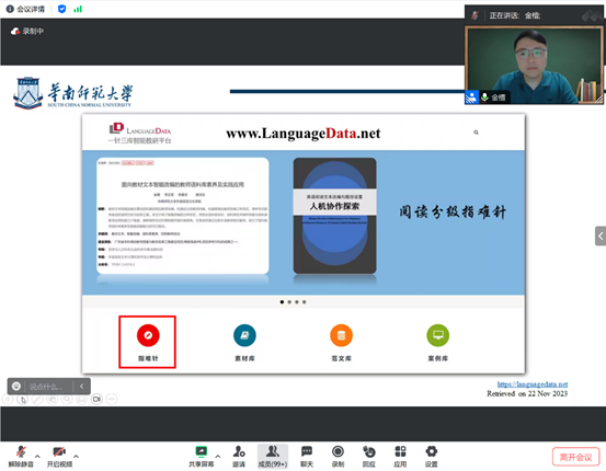 讲座过程中,金檀教授着重介绍了介绍了其开发的、并于20233月再次主持修订的阅读分级“指难针”。“指难针”参考了教育部颁布的《义务教育英语课程标准》《普通高中英语课程标准》和《大学英语课程教学要求》中提供的词表,聚焦于“难度定级”“词汇分析”与“句法分析”三大模块,从词汇、句法与篇章三个维度提供难度评估,有效地反映了源文本和目标文本的难度差异变化,为中国外语教学提供了有力支持。教师可通过对英语阅读素材进行语言难度调控,降低原始真实文本的复杂程度,增加语言可读性,使学生更好地理解文本的大致内容。“指难针”语料库的本土化、分析结果的分级化,帮助一线教师在素材改编的过程中控制难度,为学生提供更有针对性的教学,具有重要的实践意义。