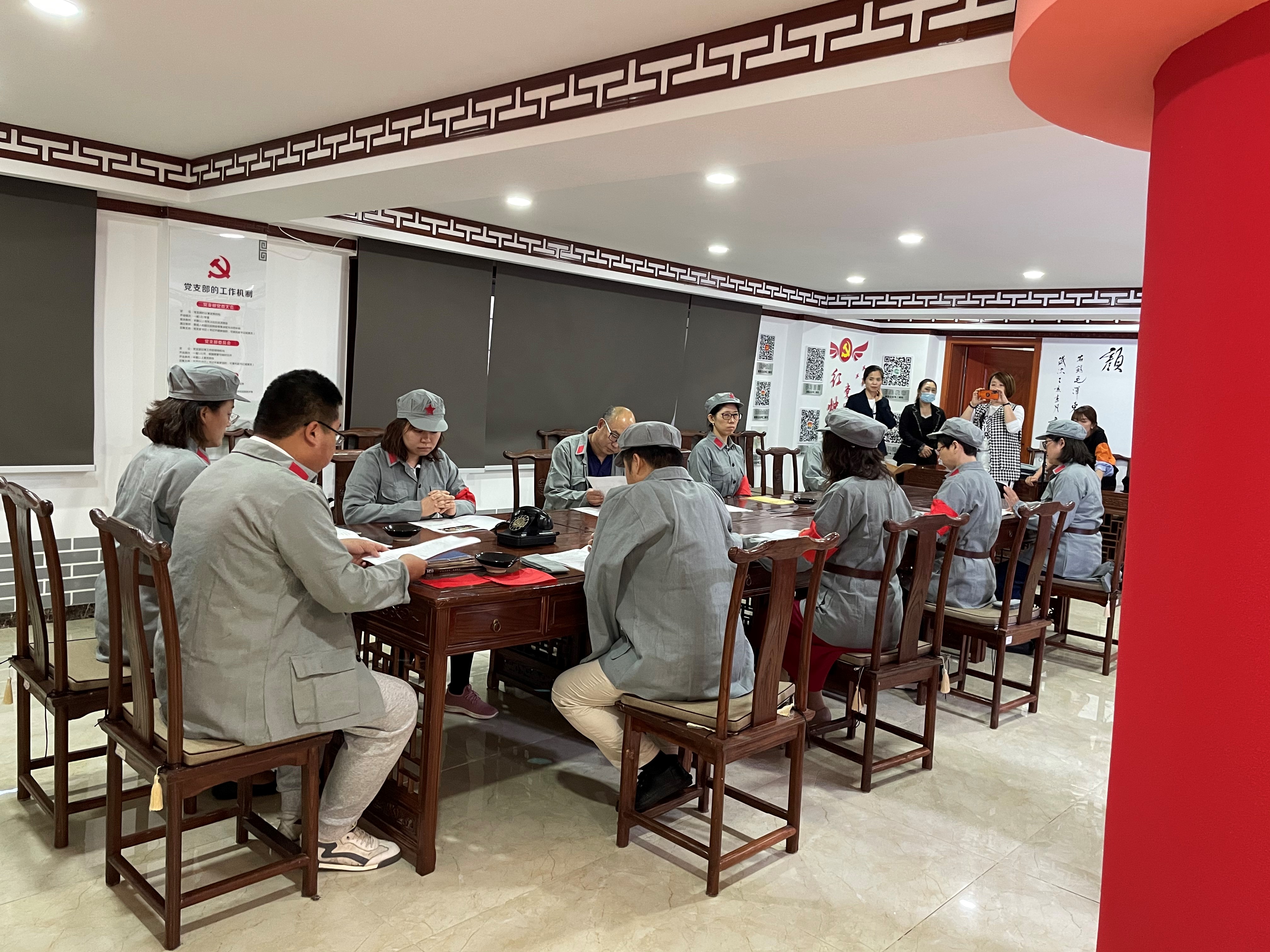 之后,在“党事体验区”第七支部党员统一换装,穿越时空,现场还原并演绎了《遵义会议》微话剧。遵义会议是1935年1月中共中央政治局在贵州遵义召开的独立自主地解决中国革命问题的一次极其重要的扩大会议。是在红军第五次反“围剿”失败和长征初期严重受挫的情况下,为了纠正博古、王明、李德等人“左”倾领导在军事指挥上的错误而召开的。通过亲身体验,第七支部党员同志们更加深刻地体会到,在极端危急的历史关头,用马克思主义基本原理解决自己的路线、方针和政策方面问题的重要性。