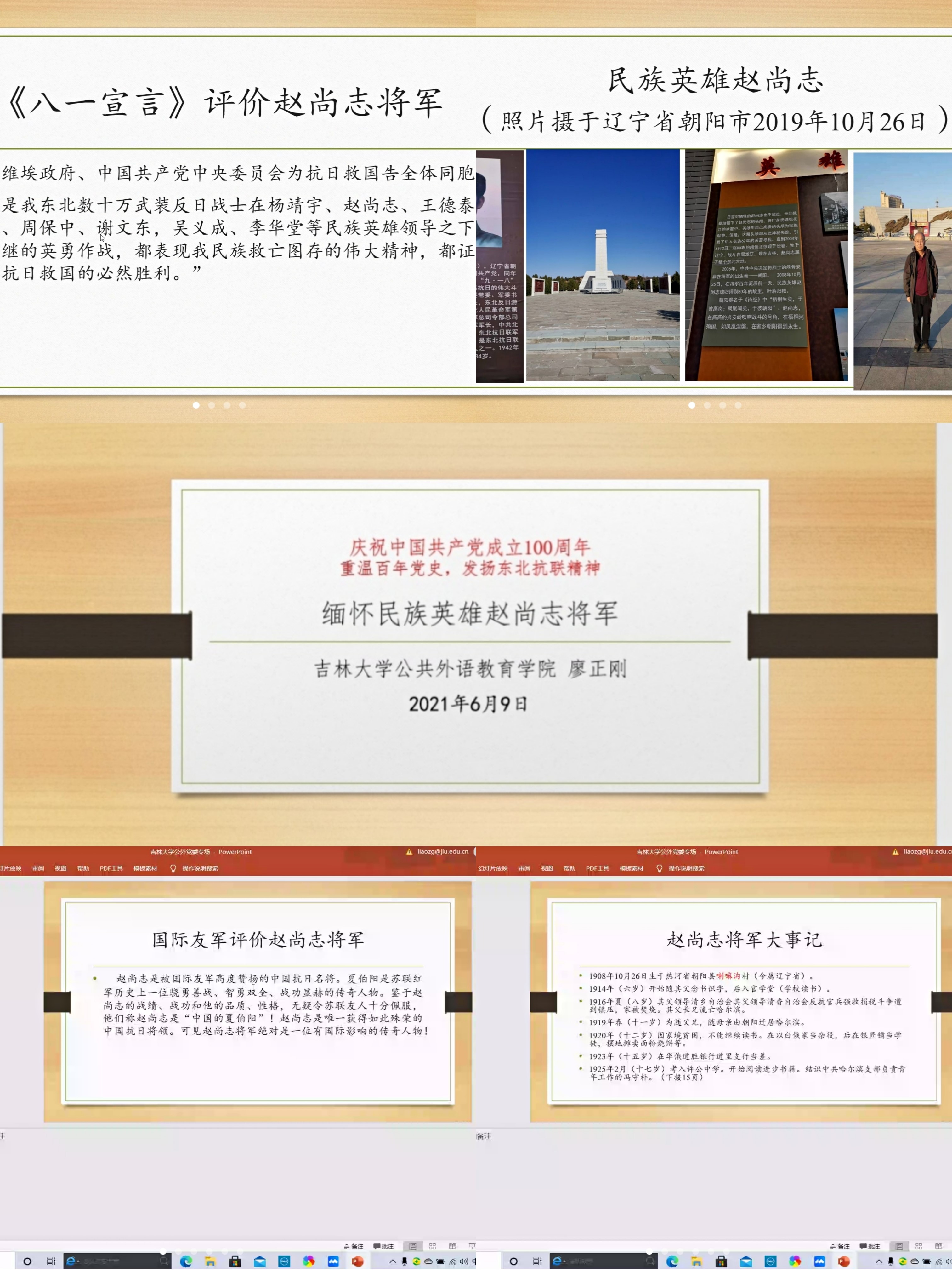 为认真领悟习近平总书记在党史学习教育动员大会上的重要讲话精神,做到学史明理、学史增信、学史崇德、学史力行,以优异成绩迎接建党一百周年,多宝真人网站党委联合教工第七党支部于2021年6月9日晚19时以线上形式召开“缅怀民族英雄赵尚志将军”主题讲座学习活动。主讲人为公共外语教育学院学术委员会委员、公共外语教育学院第七教研室主任、英语语言文学博士、硕士研究生导师廖正刚教授。会议由院党委副书记徐杰主持,学院领导班子成员及各支部党员参加了本次学习。