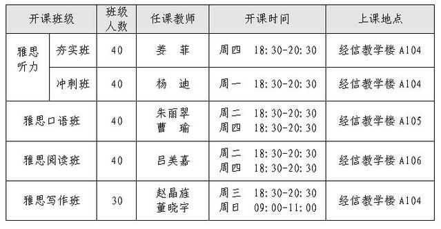本学期雅思课程每周开设雅思听力班(分为听力夯实班、听力冲刺班)、雅思口语班、雅思阅读班、雅思写作班4个班级。每班每周开课2次(听力夯实班、听力冲刺班每周各开课1次),每次2个小时,课程共计五周,预约一次即可参加该班级5周课程。