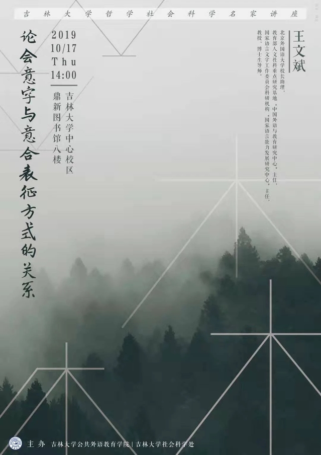 报告题目:论会意字与意合表征方式的关系报 告 人:王文斌教授 北京外国语大学讲座时间:2019年10月17日 下午14:00讲座地点:中心校区鼎新图书馆8楼学苑沙龙主办单位:多宝真人网站 吉林大学社会科学处