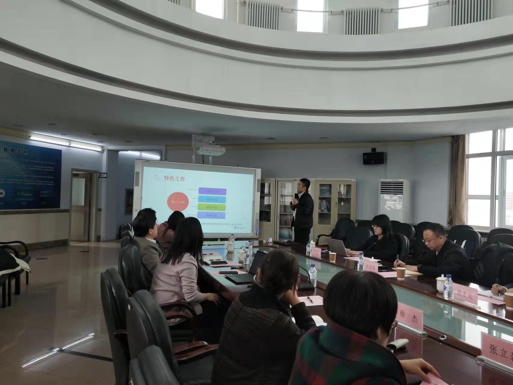 会上,院长潘海英从学院概况、大学外语教学改革进展及成效、大学外语教学中的问题及对策等方面进行了汇报;党委书记贺强围绕学院党委基本情况、工作思路及目标以及特色工作等进行了汇报。此外,与会人员围绕大学外语教育现状、面临的挑战与困难,以及课程思政建设工作等多个方面进行了深入交流与讨论。