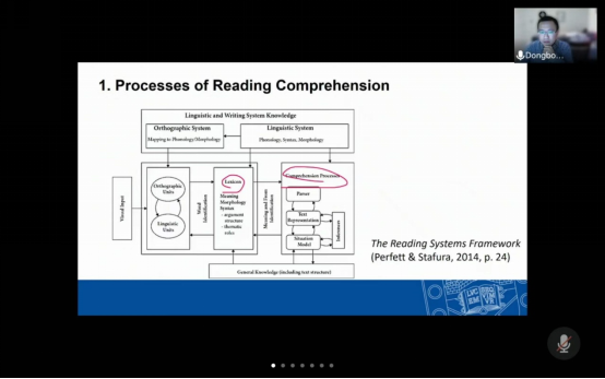 hang Dongbo教授是国际二语阅读和词汇习得领域的专家,他系列讲座题目的是:“Lexical Basis of Second Language Reading Comprehension: From Vocabulary Size and Depth to Processing Efficiency”。在讲座中,首先概括性地介绍了二语阅读的认知过程,进而阐明无论是对于书写加工、词汇提取、还是意义激活,词汇识别都是二语者进行阅读活动的前提。词汇识别不仅要求阅读者把词汇融入在线的语境,还要求阅读者选择与特定语境相匹配的词汇语义。欲使阅读流畅高效,词汇识别就要实现自动化。接下来,他阐述了二语词汇知识的多维度性,包括词汇形式、意义、使用的三位一体模式以及词汇知识广度和深度的二分特征。在此基础上,他结合该领域最近几年的研究成果,指出尽管词汇量(即词汇知识广度)与阅读能力直接相关,但是仅有词汇量是不够的,词汇深度知识(包括词汇的多义性、词块、形态变化、词义联系的网络化程度等因素)对于阅读更加重要。最后他还指出,二语阅读者的个体差异、阅读文本的差异以及阅读目的的差异也会影响二语者对于词汇的识别和加工。因此,鉴于词汇知识的多维度性,二语者在阅读过程中要逐渐学会根据不同的文本类型、阅读任务等语境因素灵活地调取词汇资源。