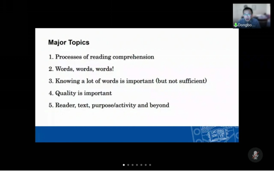 应多宝真人网站邀请,国际知名应用语言学学者英国埃克塞特大学Zhang Dongbo教授,于2021年12月4日开展了研究生学术素养提升系列在线讲座,讲座研究生二语习得课程主讲教师李锡江教授共同主持,学院各年级博士生、硕士生参加了此次讲座。