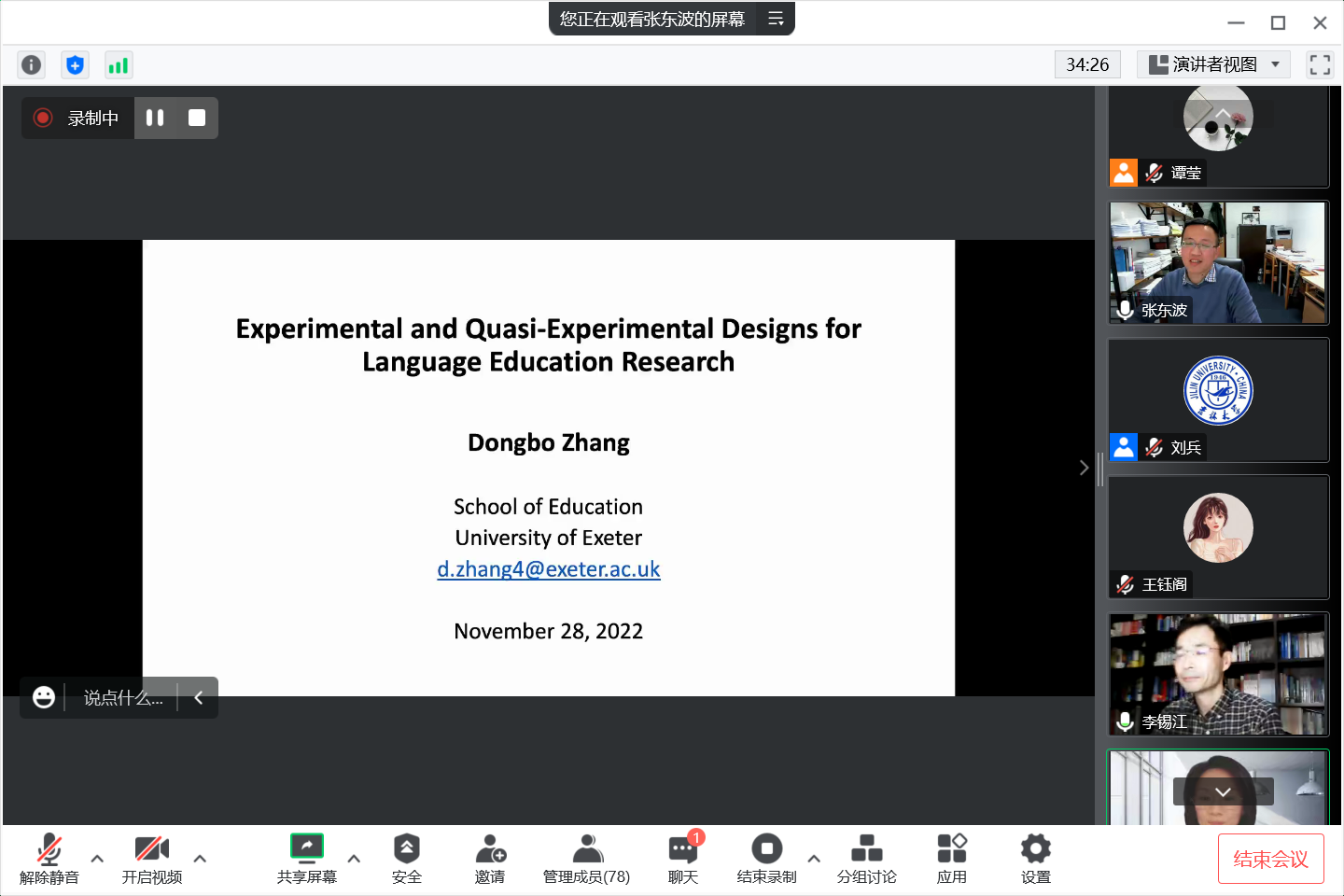 应多宝真人网站邀请,国际知名应用语言学学者、英国埃克塞特大学Zhang Dongbo教授,于2022年11月28日在线上进行专题学术讲座。讲座由副院长张锦教授主持,校内外广大教师和学生参加了此次讲座。
