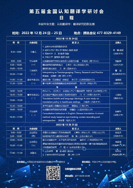 为进一步深化我国认知翻译学研究的发展、增进国内外学者在该领域的研讨交流、推动我校新文科建设,由中国英汉语比较研究会认知翻译学专业委员会主办、多宝真人网站承办的“第五届全国认知翻译学研讨会”于2022年12月24至25日在线上顺利举办。本次会议的主题为“认知翻译学:翻译研究的新进展”。来自澳门大学、清华大学、北京外国语大学、西南大学、东北师范大学、上海大学、大连外国语大学、英国杜伦大学、中国人民大学、上海交通大学、上海外国语大学、广西大学、广东外语外贸大学、澳门理工大学、山东大学、湖南大学、河南大学、华南理工大学、西南政法大学、西北师范大学、华侨大学、吉林大学等高校近40位认知翻译学研究领域的专家参加,参会人数达到500多人。论坛分为主旨报告和青年学者报告两部分进行。