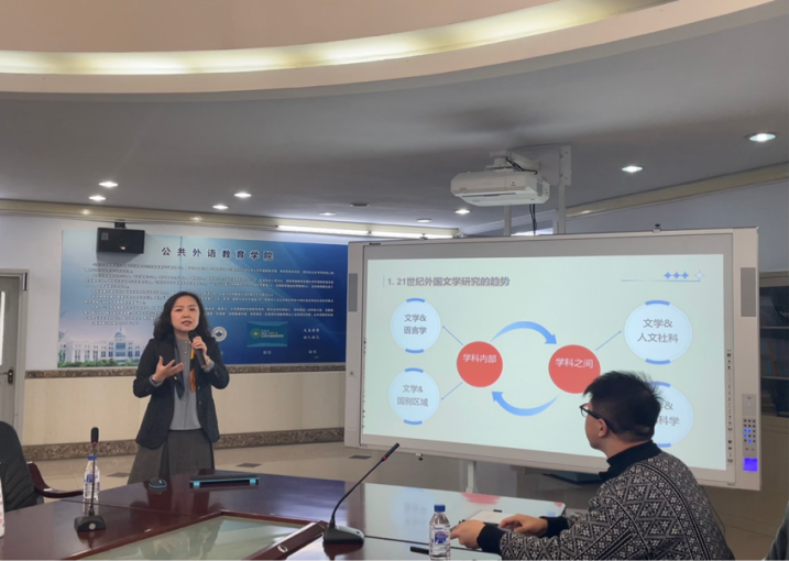 专家主题报告环节于上午9点开始,公共外语教育学院朴玉教授和杨梅教授先后针对自身研究领域分享了研究成果及研究心得。朴玉教授以“选题·思路·方法——以21世纪美国小说研究为例”为题,探讨了如何挖据文学研究中的热点问题,并结合文化研究、社会学、心理学以及其他领域的理论视角进行学术论文写作。杨梅教授以 “构建中国特色对外话语实践研究” 为题,从对外话语体系建构视角分析中国在海外世界的国际形象,探索中国特色对外话语实践路径,旨在闸释中国话语兼收并蓄的开放胸怀、提升中国话语国际影响力、助力中外文明交流互鉴。