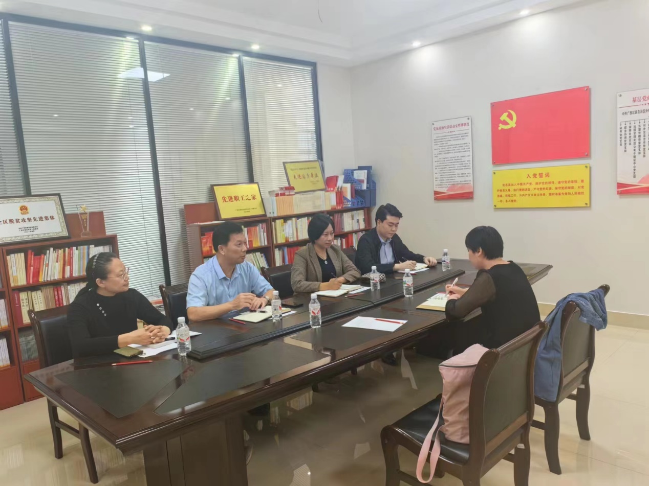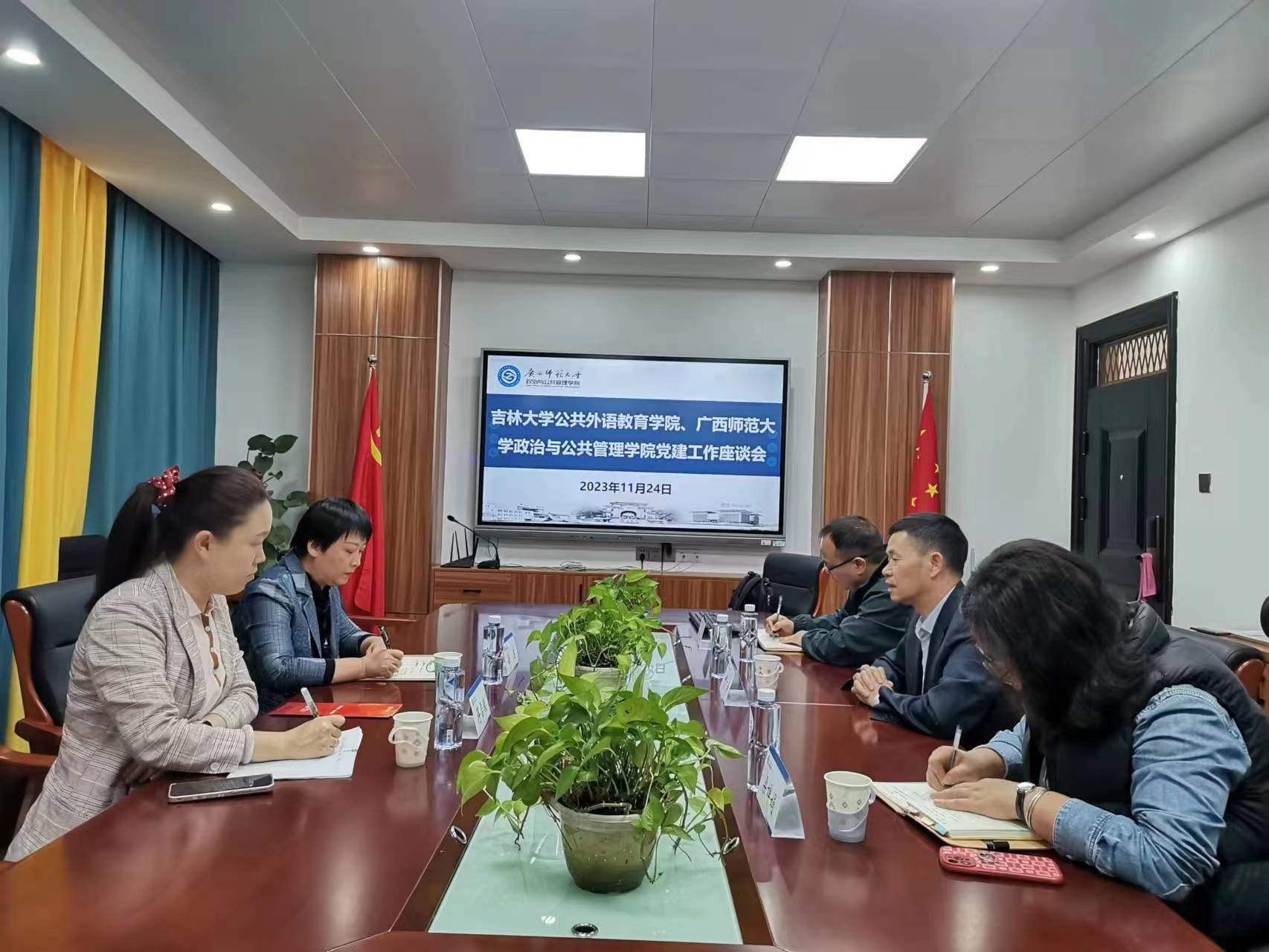1124下午,徐杰一行赴广西师范大学政治与公共管理学院就党建工作开展座谈交流,政治与公共管理学院党委书记何广寿、党委副书记梁婵娟、社会学与社会工作系教工党支部书记覃琮和办公室主任徐祺琪出席座谈会。