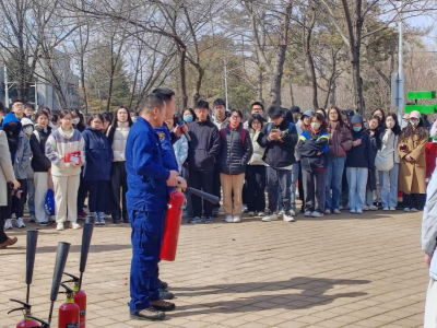 随后,警报响起,同学们有序地从安全通道撤出大楼。在广场上,保卫处的工作人员向大家一一演示了防毒面具、灭火毯及两种灭火器的用法,并鼓励同学们亲身体验如何使用各种消防器材。在演练过程中,同学们认真学习,密切配合。