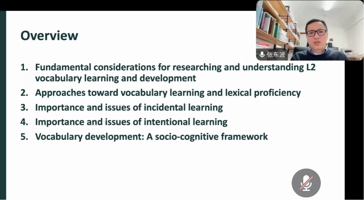 为推动促进我院科学研究工作的深入发展,公共外语教育学院于20241116日晚邀请国际知名二语阅读和词汇习得领域专家、英国埃克塞特大学张东波教授举办线上学术讲座。本次讲座由学院主管科研工作副院长张锦教授和二语习得方向学术带头人李锡江教授共同主持。本学院教师、各年级博士研究生、硕士研究生参加了此次讲座。